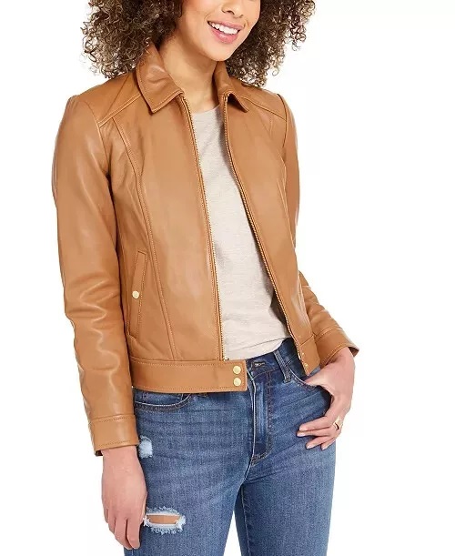 Cole Haan Women's Leather Shirt Collar Jacket, Hazelnut, Medium
